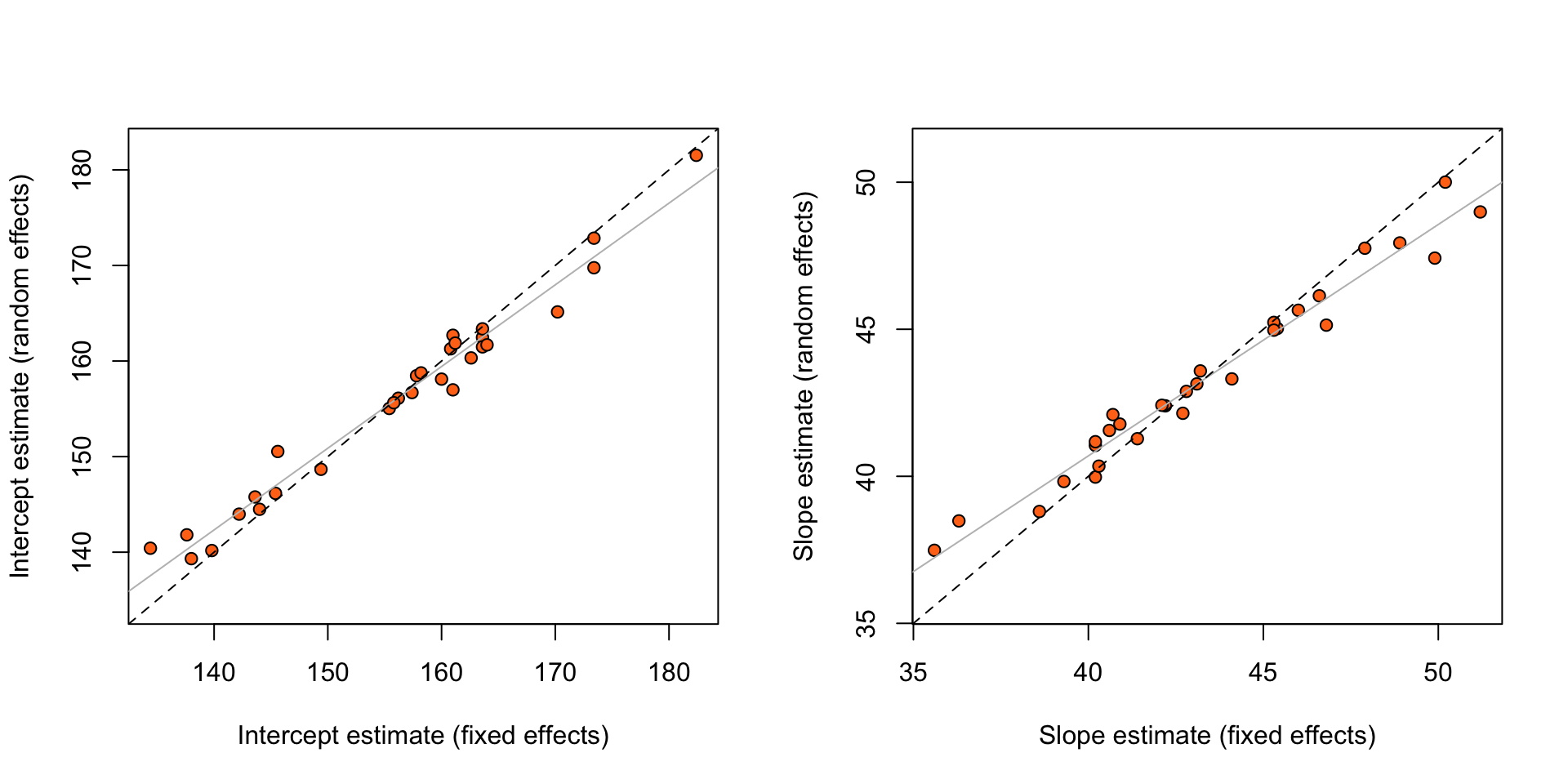 abline(a = 0, b = 1, lty = 2)Figure 5: Estimates of random and fixed effects for the rat growth data. The dashed line is a line with intercept zero and slope 1, and the solid line is from the least squares fit of the observed points.