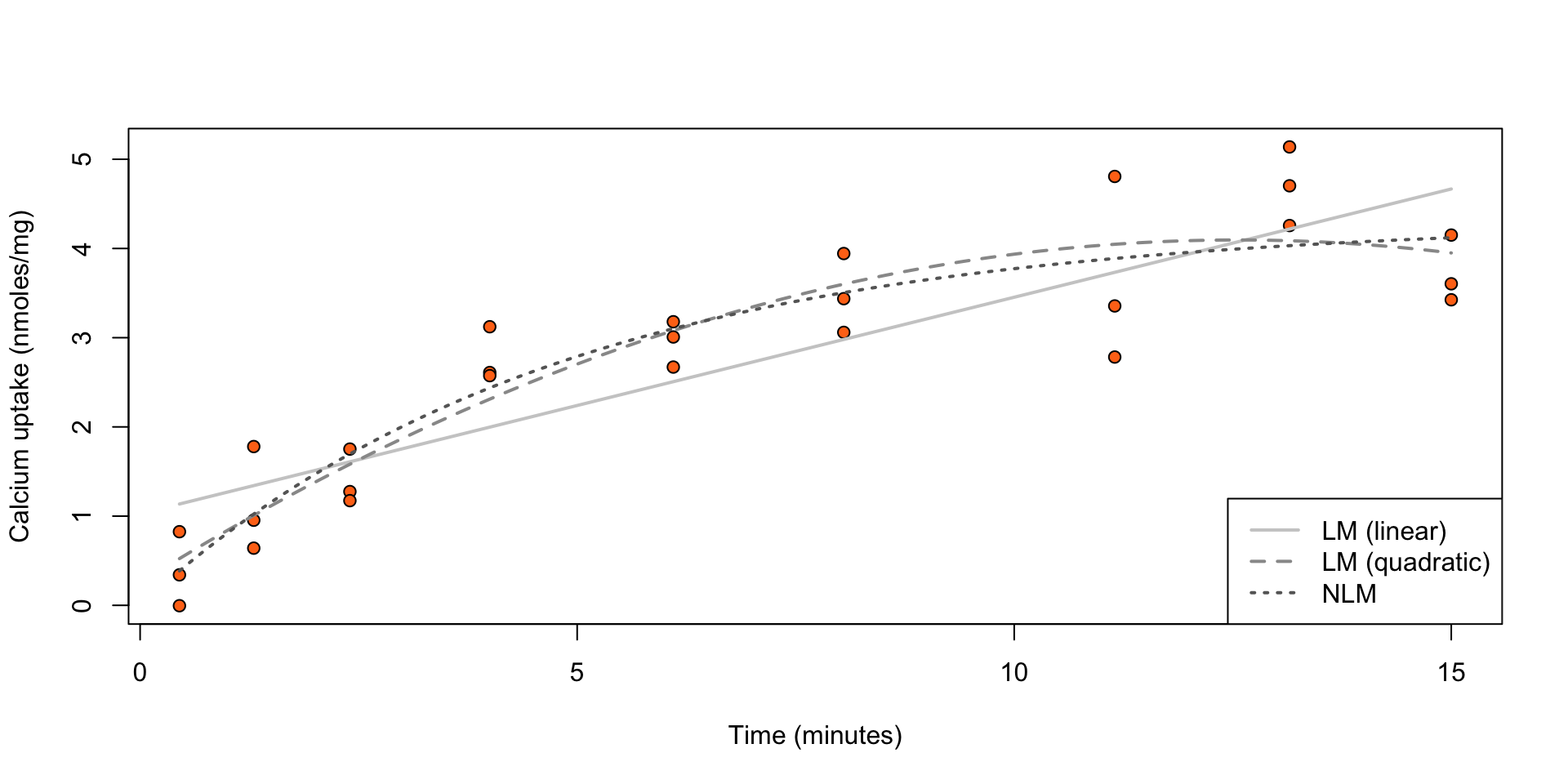 col = gray(c(0.8, 0.6, 0.4)), lty = 1:3, lwd = 2)Figure 2: Calcium uptake against time, overlaid by estimated expected uptake from three models with \(\eta(t, \beta) = \beta_1 + \beta_2 t\) (LM (linear)), \(\eta(t, \beta) = \beta_1 + \beta_2 x + \beta_3 t^2\) (LM (quadratic)), \(\eta(t, \beta) = \beta_0 ( 1 - \exp ( - t / \beta_1 ))\) (NLM).