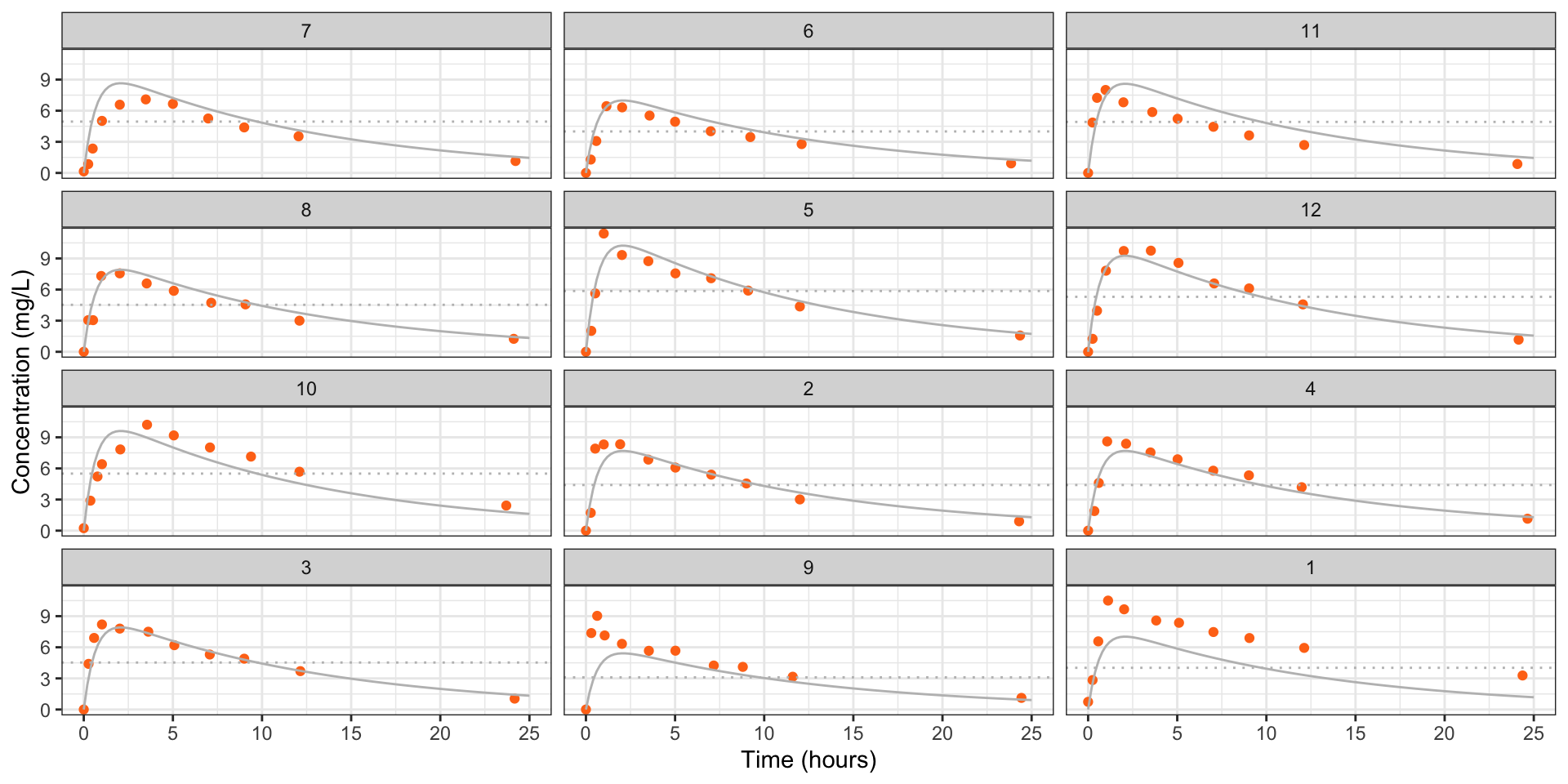 geom_line(data = pred_df, aes(Time, conc), col = "grey") Figure 5: Estimated concentrations (grey) for each individual in the theopylline study from the nonlinear model \(Y_{ij} = \eta'(\gamma, D_i,t_{ij}) + \epsilon_{ij}\), \(\epsilon_{ij} \stackrel{\text{ind}}{\sim}{\mathop{\mathrm{N}}}(0,\sigma^2)\). The dotted line is the administered dose.