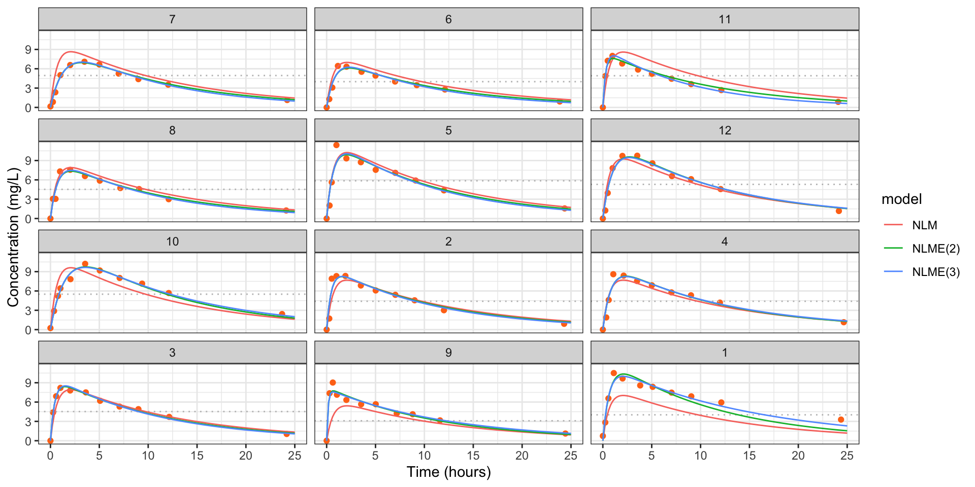 geom_line(data = pred_df_all, aes(Time, conc, color = model))Figure 6: Estimated concentrations for each individual in the theopylline study from model (NLM), model with two effects varying (NLME(2)) and the model with all effects varying (NLM(3)). The dotted line is the administered dose.