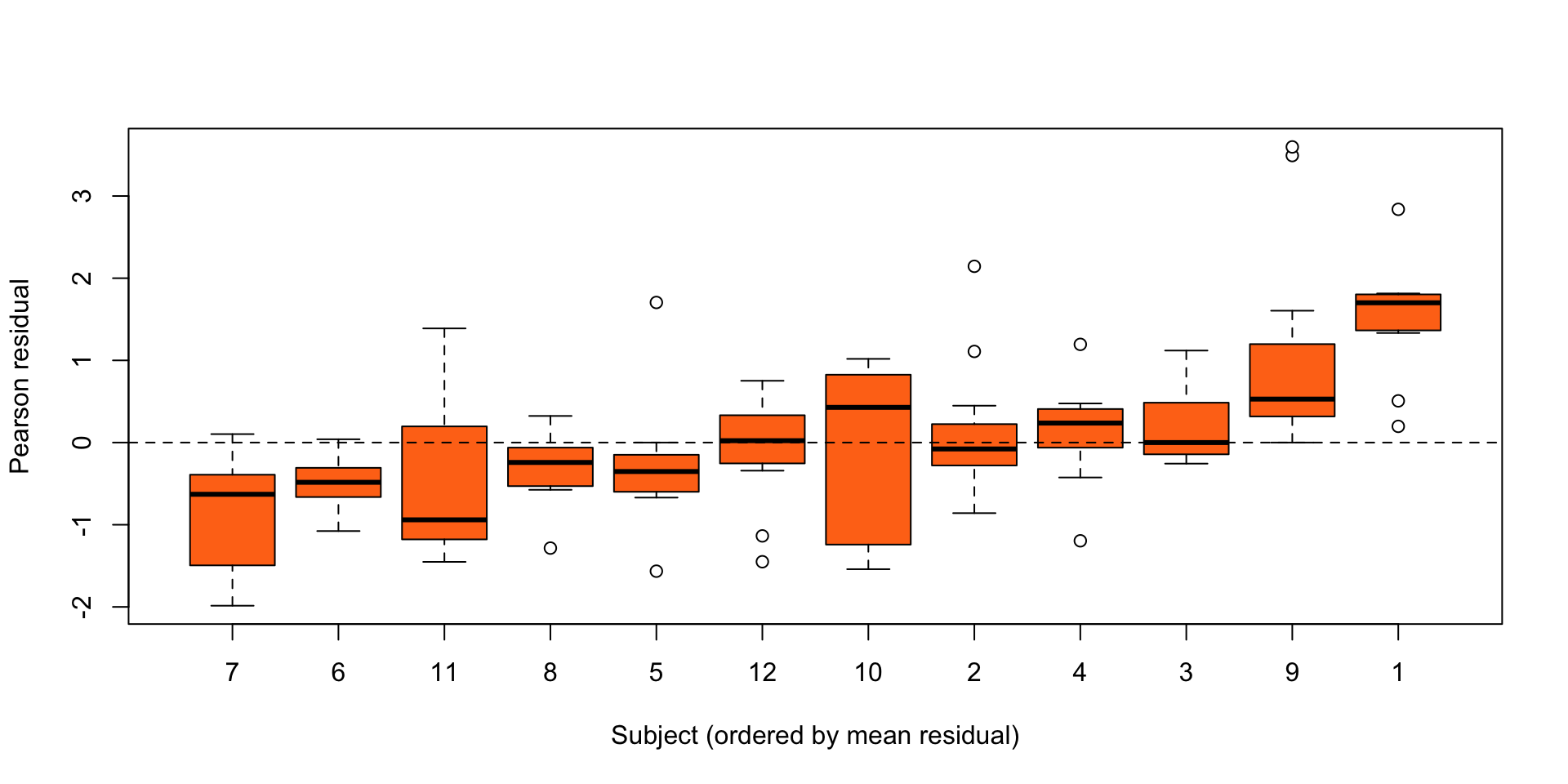 abline(h = 0, lty = 2)Figure 4: Residuals for each individual in the theopylline study from the nonlinear model \(Y_{ij} = \eta'(\gamma, D_i,t_{ij}) + \epsilon_{ij}\), \(\epsilon_{ij} \stackrel{\text{ind}}{\sim}{\mathop{\mathrm{N}}}(0,\sigma^2)\).