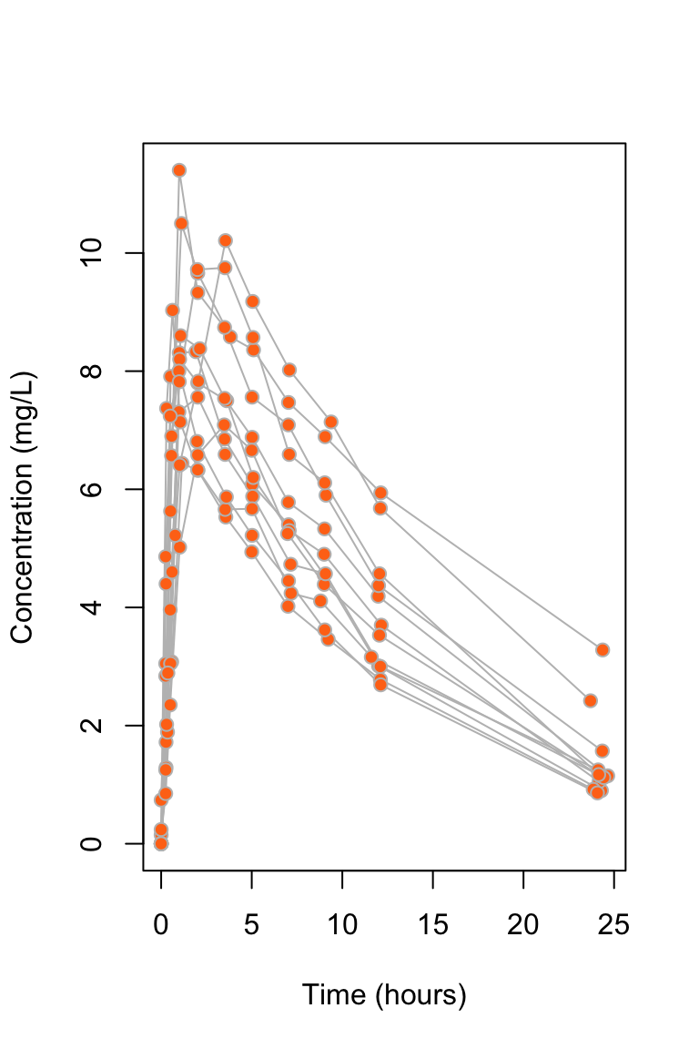 bg = "#ff7518", pch = 21, col = "grey")Theophylline is an anti-asthmatic drug. An experiment was performed on \(12\) individuals to investigate the way in which the drug leaves the body. The study of drug concentrations inside organisms is called pharmacokinetics.
