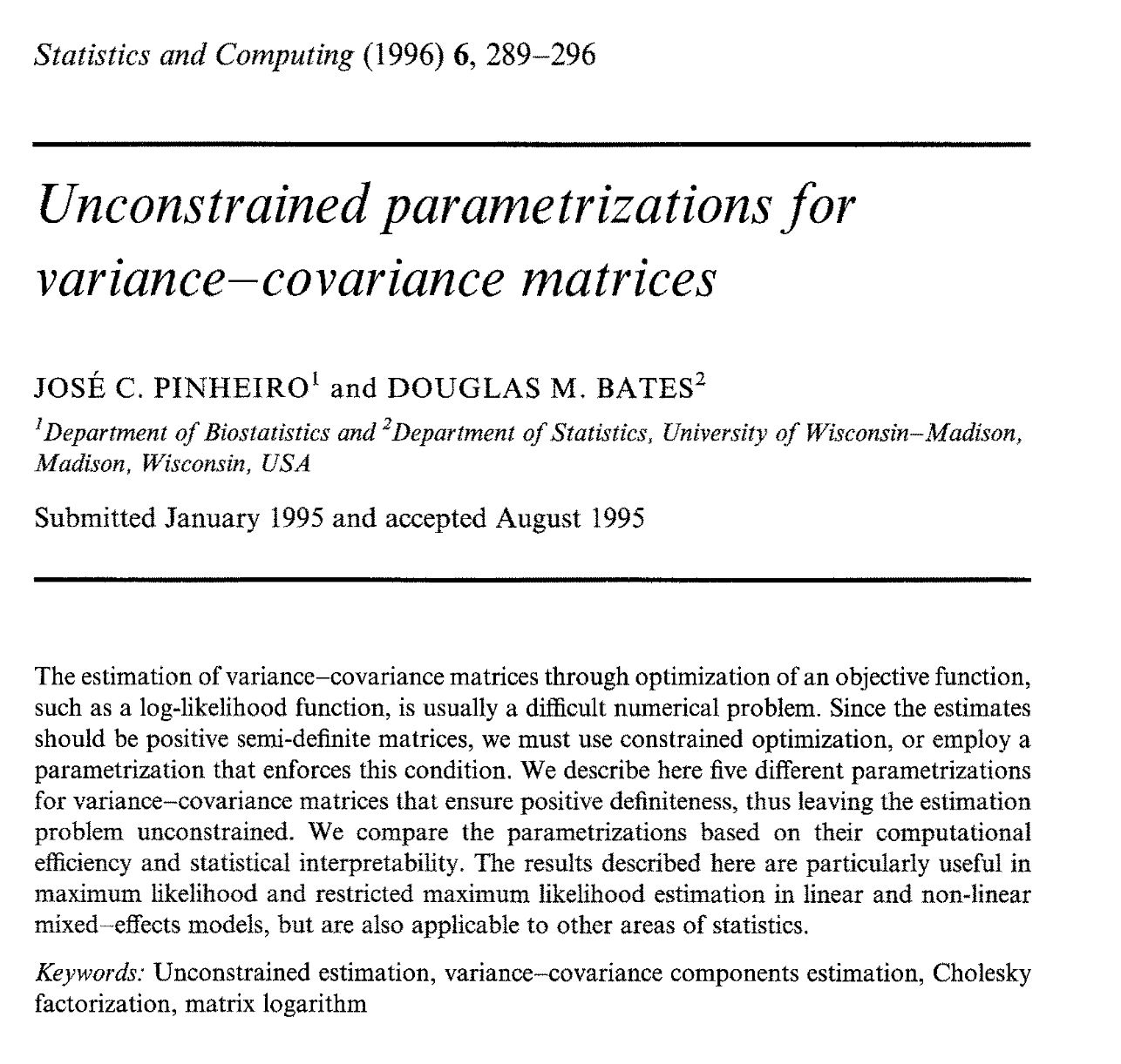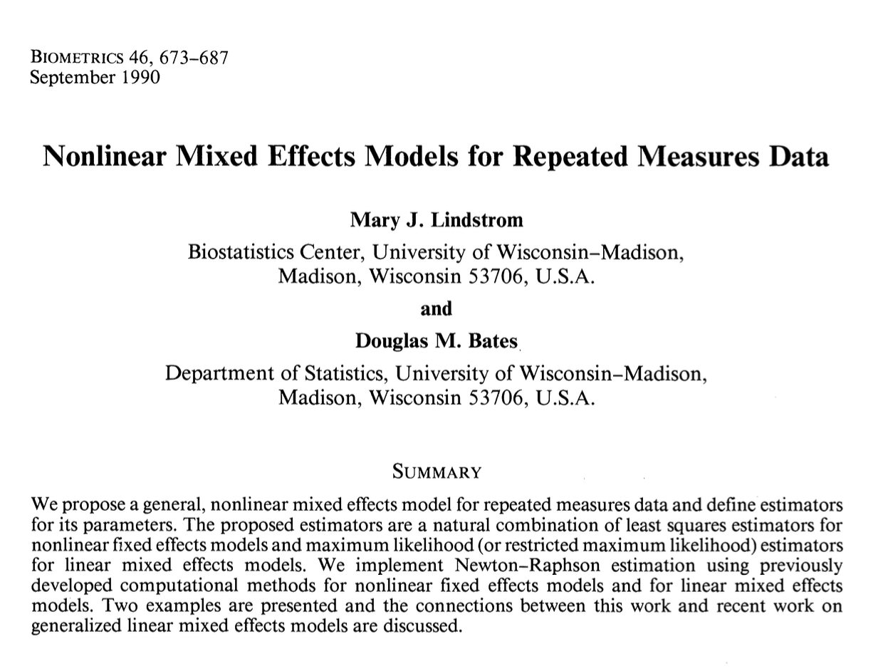 \[ Y_{ij} = \eta(\beta + A b_i, x_{ij}) + \epsilon_{ij} \,, \quad \epsilon_{ij} \stackrel{\text{ind}}{\sim}{\mathop{\mathrm{N}}}(0,\sigma^2)\,, \quad b_i \stackrel{\text{ind}}{\sim}{\mathop{\mathrm{N}}}(0,\Sigma_b) \] where \(\Sigma_b\) is a \(q \times q\) covariance matrix and \(A\) is a \(p \times q\) matrix of zeros and ones, which determines which parameters are fixed and which are varying.